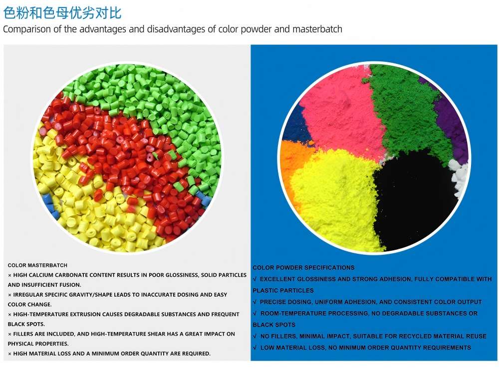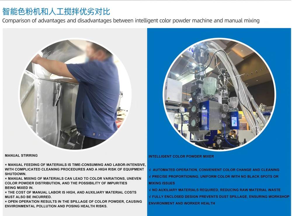 100 kg/oraLa "Miscelazione intelligente delle polveri colorate" può essere perfettamente integrata con sistemi di alimentazione centralizzati, sistemi di trasporto centralizzati e sistemi di movimentazione automatica dei materiali. Il Plastic Color Mixer è dotato di sensori di pesatura ad alta precisione, che garantiscono l'uniformità del processo di miscelazione e la consistenza del colore e supportano il dosaggio automatico di polveri e additivi multicomponente.